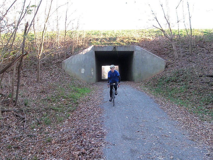 I wanted to create action shots of Tim as he emerged from this tunnel under a highway on the Tunnel Hill Bike Trail. In continuous shooting mode, my Canon Powershot A590 will take 1.4 shots per second. I failed to switch to continuous shooting mode in time and was only able to get off a single shot as he left the tunnel.